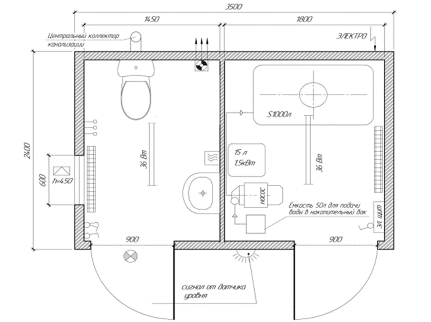 Унитаз-компакт – 1 шт. Раковина с нажимным смесителем – 1 шт Насосная станция – 1 шт. Емкость для воды, 1000 л. – 1 шт Водонагреватель 15 л – 1 шт. Сигнализатор минимально уровня воды в баке, с выводом на наружную стену и блокировкой работы насосной станции. Разводка ХВС, ГВС и канализации с выводом наружу через заднюю стену. |