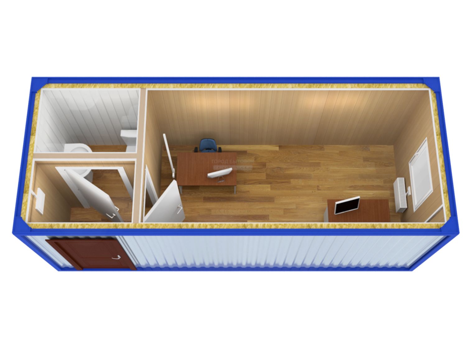 - Разводка трубы воды и канализации выполнена для подключения к наружным сетям. Если требуется полностью автономный блок-контейнер обратитесь к менеджеру.