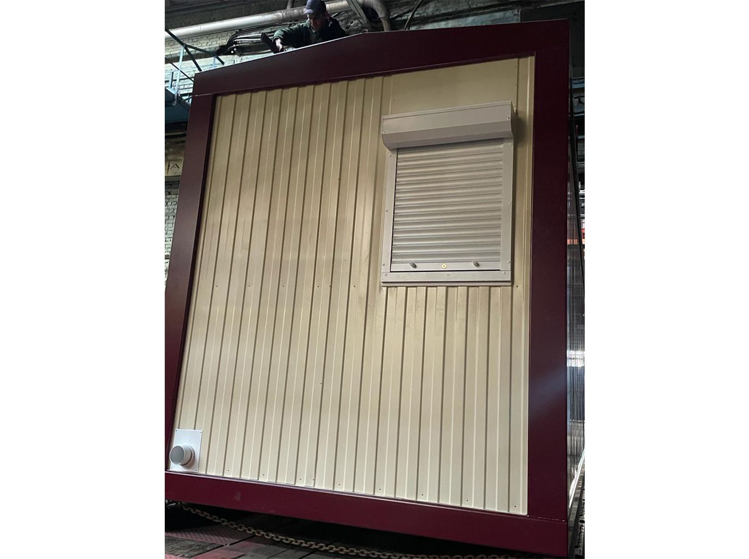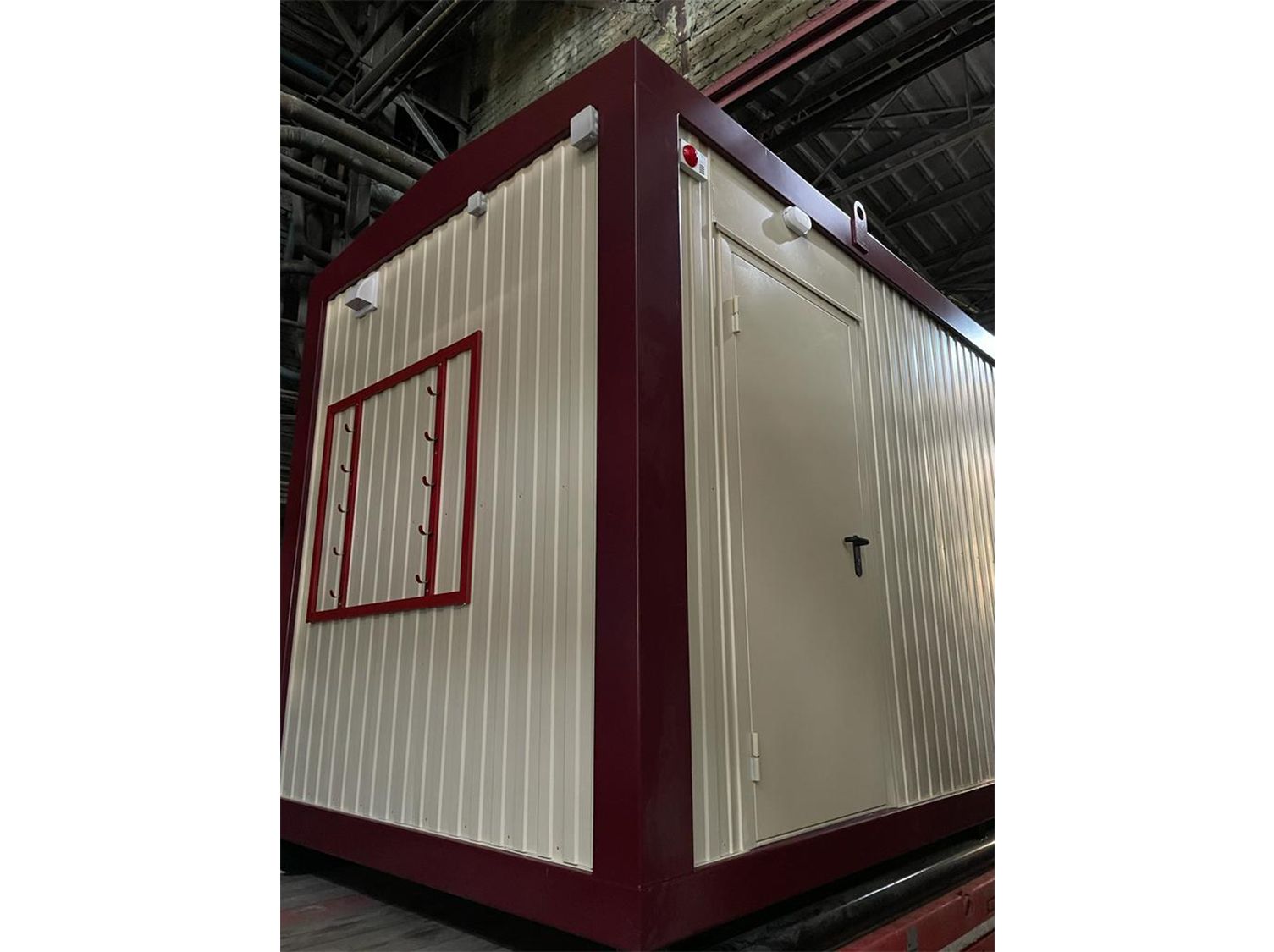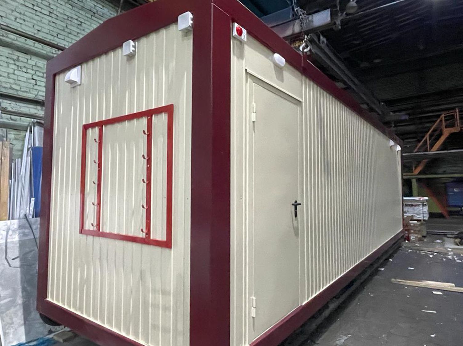 Каркас:Металлический, сварнойКровля:Двухскатная, трапециевидная, сварная. Металлический лист 1.5 ммУтепление:Потолок, стены : минеральная плита. Толщина – 15 0 ммПаро - гидроизоляционная пленка «Изоспан»Пол: пенополистирол экструзионный с добавлением антипиренов, само затухающий, относящийся к группе Г1 - слабо горючих материалов толщина утеплителя 150ммСтыки утеплены негорючей монтажной пеной. Класс горючести - НГПол:Доска 25х100 ммПлинтус ПВХЦСП 16 ммМеталлический лист , 1.2 ммАнтикоррозионное покрытиеАвтомобильная резинобитумная мастика ГФ021 в 2 слояУтепление 15 0 мм. Пароизоляция тип «В»Линолеум п/коммерческийВходная группа:Металлическая дверь заводского изготовления (Россия), с врезным замком, доводчиком и ручкой прижимом. 87 0х20 7 0 мм – 1 штПерегородка:Перегородка с ламинированной МДФ дверью – 3 штРазмеры::9.0 х 2. 45 х 2. 8 (3.0)Отопление:Биметаллические радиаторы – 5 штРазводка ПВХ трубМасса:Не более 50000 кгОтделка:Наружная: Профилированный лист С8, с полимерным покрытием, RAL 3005Внутренняя: Профилированный лист С8, с полимерным покрытием, RAL 3005Окраска:Каркас: грунт - эмаль по металлуОкна:ПВХ, 90 0 х 110 0 мм, трёх - камерный профиль, двухкамерный стеклопакет, поворотно - откидное – 2 штМоскитная сетка – 2 штРольставни механически – 2 штПока нет комментариев