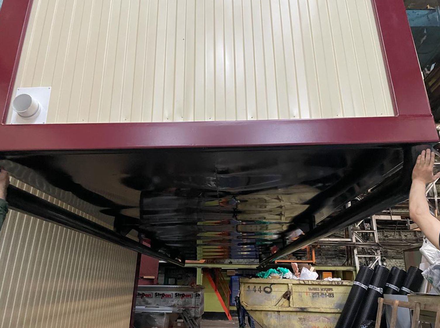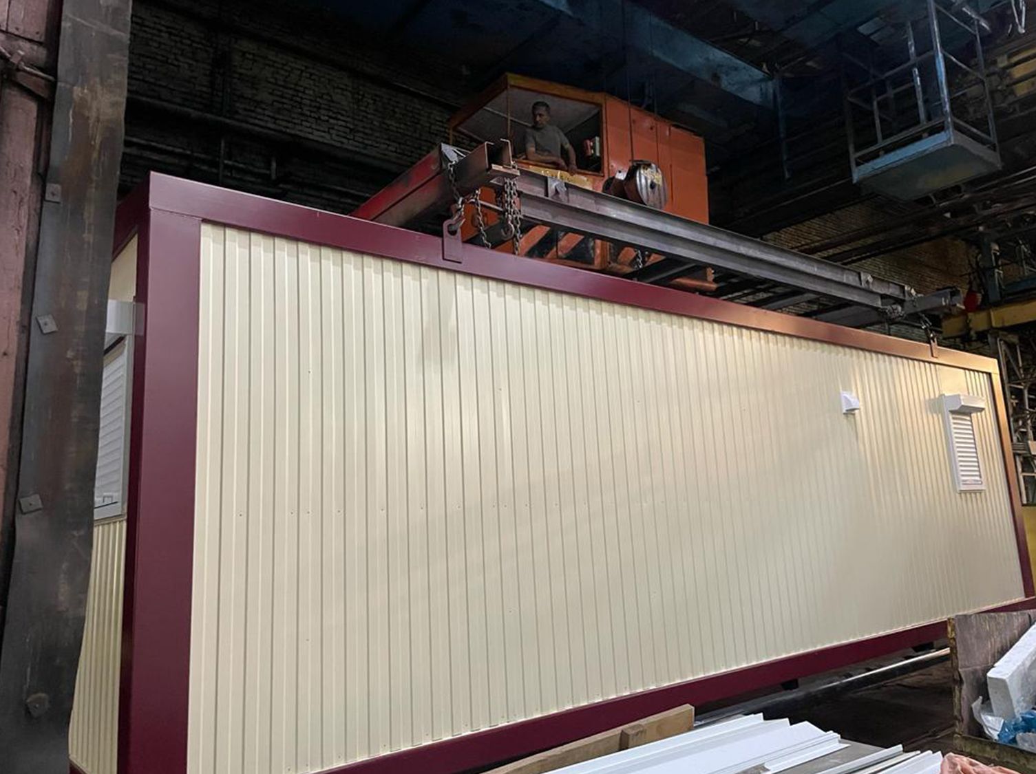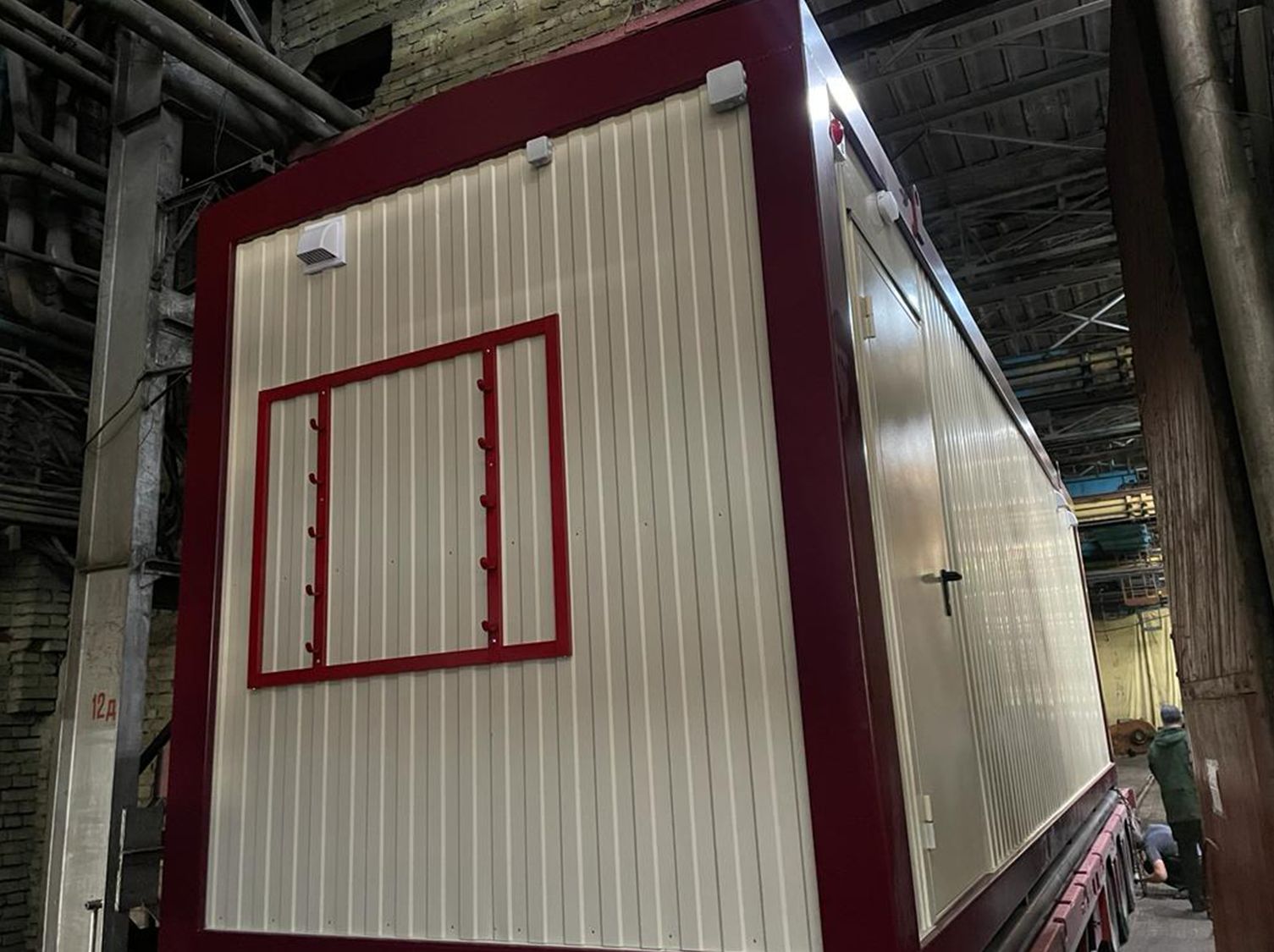 Каркас:Металлический, сварнойКровля:Двухскатная, трапециевидная, сварная. Металлический лист 1.5 ммУтепление:Потолок, стены : минеральная плита. Толщина – 15 0 ммПаро - гидроизоляционная пленка «Изоспан»Пол: пенополистирол экструзионный с добавлением антипиренов, само затухающий, относящийся к группе Г1 - слабо горючих материалов толщина утеплителя 150ммСтыки утеплены негорючей монтажной пеной. Класс горючести - НГПол:Доска 25х100 ммПлинтус ПВХЦСП 16 ммМеталлический лист , 1.2 ммАнтикоррозионное покрытиеАвтомобильная резинобитумная мастика ГФ021 в 2 слояУтепление 15 0 мм. Пароизоляция тип «В»Линолеум п/коммерческийВходная группа:Металлическая дверь заводского изготовления (Россия), с врезным замком, доводчиком и ручкой прижимом. 87 0х20 7 0 мм – 1 штПерегородка:Перегородка с ламинированной МДФ дверью – 3 штРазмеры::9.0 х 2. 45 х 2. 8 (3.0)Отопление:Биметаллические радиаторы – 5 штРазводка ПВХ трубМасса:Не более 50000 кгОтделка:Наружная: Профилированный лист С8, с полимерным покрытием, RAL 3005Внутренняя: Профилированный лист С8, с полимерным покрытием, RAL 3005Окраска:Каркас: грунт - эмаль по металлуОкна:ПВХ, 90 0 х 110 0 мм, трёх - камерный профиль, двухкамерный стеклопакет, поворотно - откидное – 2 штМоскитная сетка – 2 штРольставни механически – 2 штПока нет комментариев