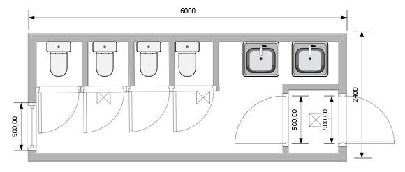 Блок-Контейнер сантехнический с тамбуром с умывальниками и четырьмя туалетами модель: РС-С04 6.0х2.4х2.5