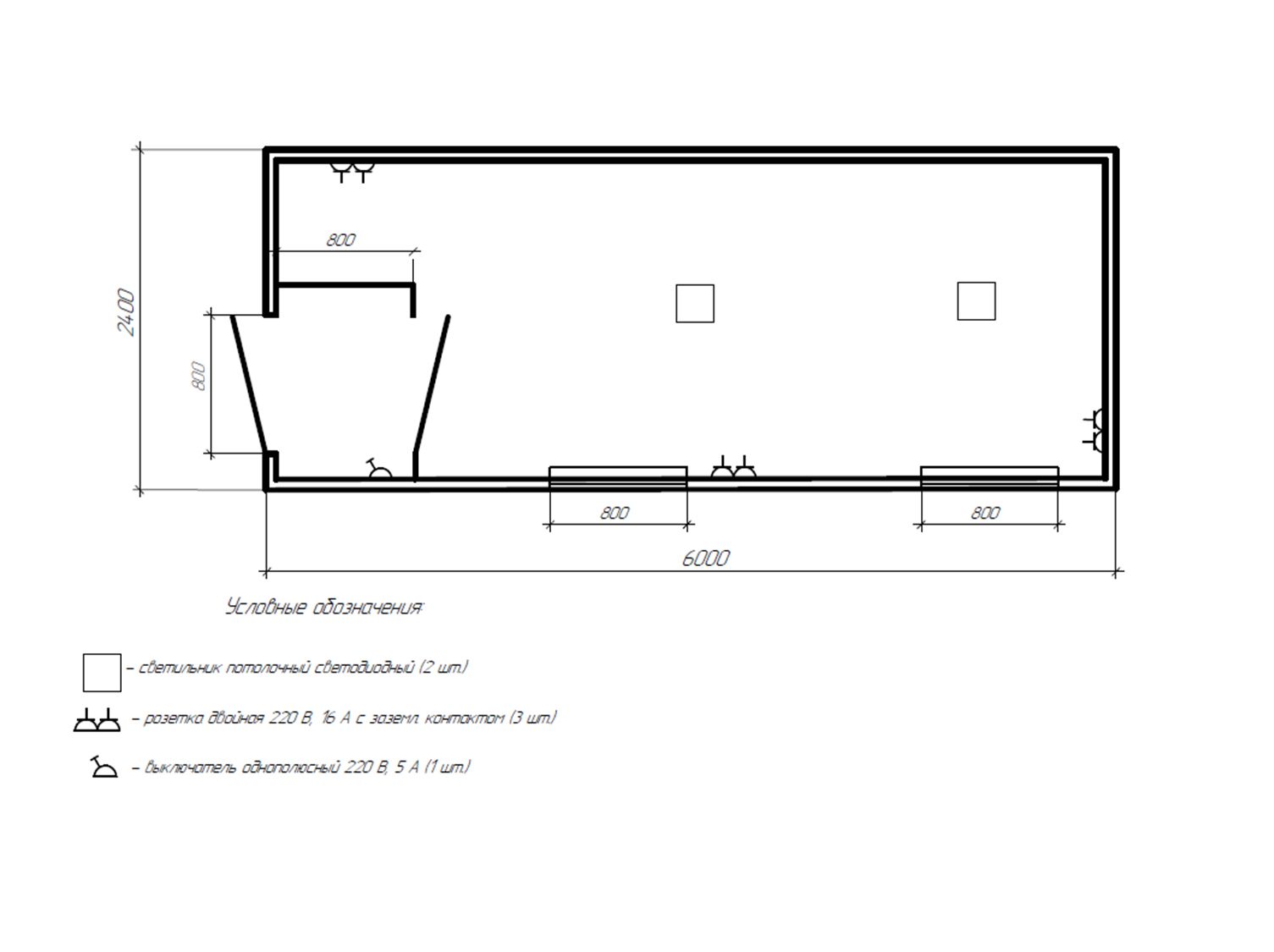 Каркас:Металлический, сварной, усиленный. С возможностью установки в два яруса.Кровля:Плоская, сварная. Металлический лист 1.2 мм, окрашен в RAL7004Утепление:Стены, потолок – минеральная плита. Толщина – 100 мм. Паро-гидроизоляционная пленка «Изоспан» или аналогПол:Пароизоляция тип «В»Плинтус ПВХДоска 40х100 ммЦСП 12 ммЛинолеум п/коммерческийОцинкованный лист. Утепление 150 ммВходная группа:Металлическая дверь противопожарная EI30, 900х2000 мм, заводского изготовления (Россия), с врезным замком, ручкой прижимом. Цвет серый.Электропроводка:Уложен в ПВХ кабель канал (наружным способом)Светильник светодиодный – 2 штРозетки двухместные – 5 штВыключатель одноклавишный – 2 штКабель медный ВВГнг 5 х 4 (вводный)Прожектор светодиодный, уличный, 30Вт – 1 штАвтоматический выключатель 25А – розеткиРозетка для подключения ССИ, 63А + вилка ССИ, 63ААвтоматический выключатель 10А – освещениеКабель медный ВВГнг 3 х 2,5 мм (розетки)Кабель медный ВВГнг 3 х 1,5 мм (освещение)Отопление:Электрический конвектор с терморегулятором, 1.5 кВт – 1 штРазмеры (Д х Ш х В):6.0 х 2.4 х 2.5Масса:Не более 2000 кгОтделка:Наружная: Профилированный лист С-8, толщиной 0.5 мм, с полимерным покрытием RAL7004Внутренняя: Стены: МДФ панель толщиной 10мм цвет под дерево Потолок: ПВХ панели цвет белыйПотолок: ЛДСП толщиной 10мм. Цвет белыйПерегородка утепленная 50мм отделка ЛДСП 10мм под деревоОкраска:Каркас: грунт-эмаль по металлу, цвет светло-серый (RAL7004)Окна:ПВХ, 900 х 1100 мм, трех-камерный профиль, двухкамерный стеклопакет, с импостом, поворотно-откидные – 1 штДвери:Внешняя: Металлическая дверь заводского изготовления (Россия), с врезным замком и ручкой прижимом. 870х2070 мм – 1 штВнутренняя: МДФ 800х2000 светлых тоновВентиляция:Естественная. Через окна и двериПока нет комментариев