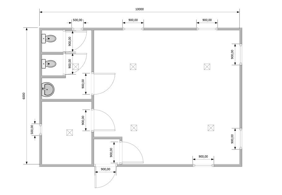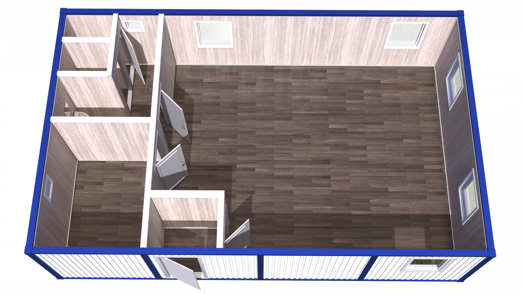 Модульное здание штаб строительства с тамбуром, кладовой и двумя туалетами модель: РС-М03 6.0 х 9.6 х 2.6