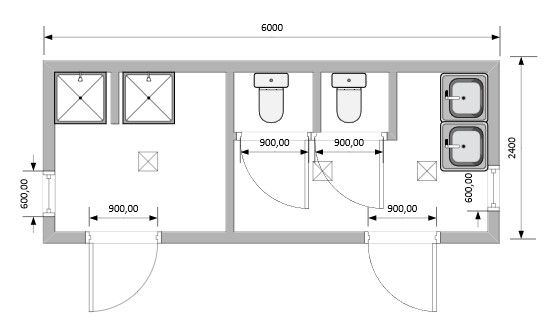 Раковина с пьедесталом и смесителем – 2 шт. Зеркало – 2 шт. Унитаз компакт – 2 шт. Держатель для бумаги – 2 шт. Душевой поддон с лейкой – 2 шт. Подключение к ХВС и ГВС – централизованное Вывод канализации наружу, место вывода – по согласованию с заказчиком. |