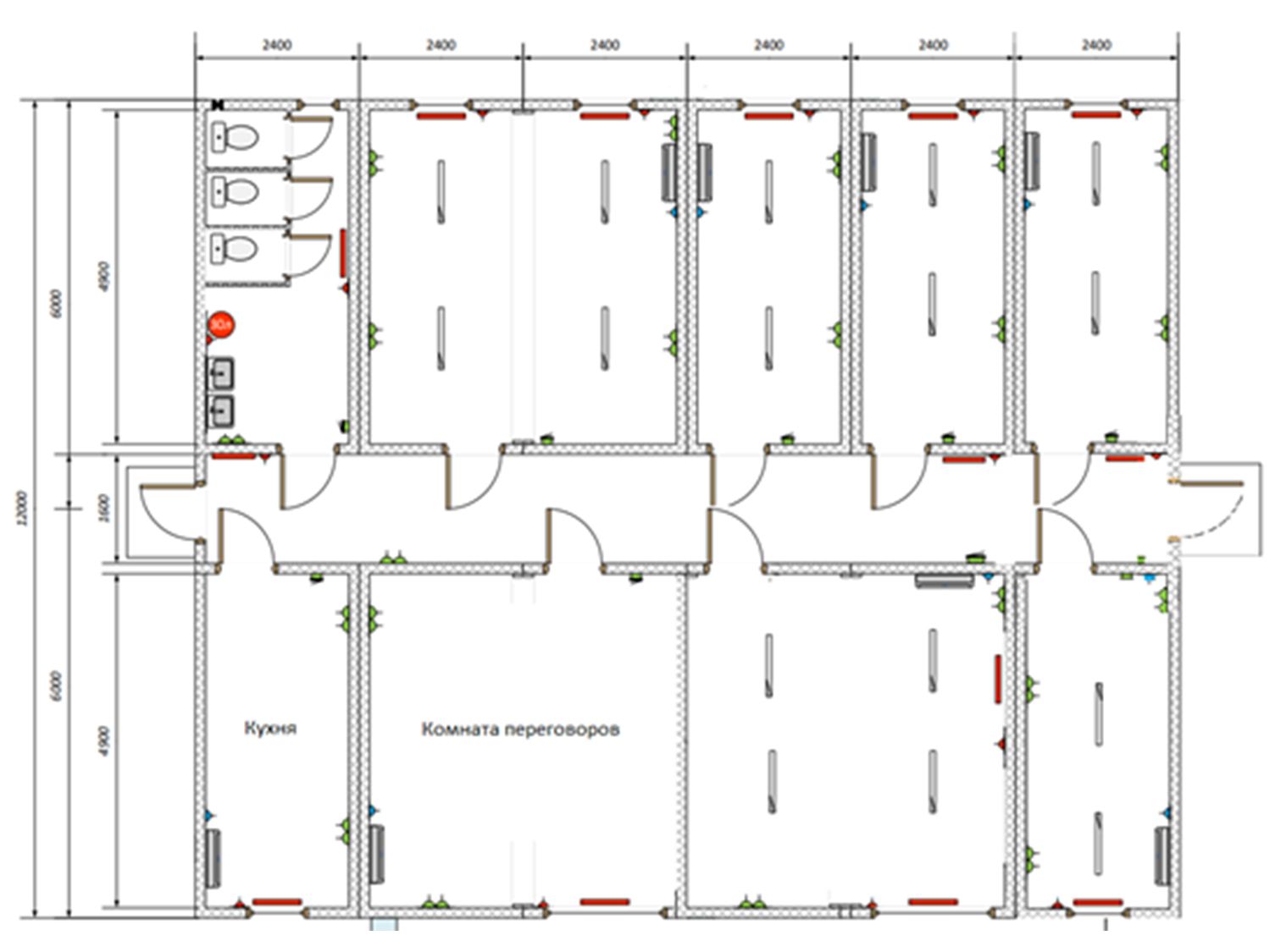 Каркас:Металлический, сварной. Все деревянные элементы обработаны огне-биозащитным составом. Стыки блок контейнеров закрыты фасонными элементами из плоского листа с полимерным покрытием, RAL по согласованиюКровля:Кровля блок контейнеров – плоская, сварнаяЛист металлический 1.5 ммОбщая кровля двухскатнаяЛист профилированный НС-35 с полимерным покрытием (RAL по согласованию)Пространственные металлические фермы: труба профильная 60х40 ммВысота в коньке 1400 ммФронтоны подшиты профилированным листом С-8 с полимерным покрытиемРешетка вентиляционная – 2 штУтепление:Стены: Минеральная плита. Толщина – 100 мм. Паро- гидроизоляционная пленкаПотолок: Минеральная плита. Толщина – 100 мм. Паро- гидроизоляционная пленкаПол:Оцинкованный лист. Утепление 150 мм. Деревянные лаги из бруса 150х40 мм. Пароизоляция тип «В». Доска 40х100 мм. ОСБ, толщиной 18 мм. Линолеум п/коммерческий. Плинтус ПВХВходная группа:Металлическая дверь, заводского изготовления (Россия), с врезным замком, доводчиком и ручкой прижимом, 970х2070 мм – 2 штЭлектропроводка:Уложен в ПВХ кабель-канал (наружным способом)Автоматический выключатель 25А – розеткиКабель медный ВВГнг 3,0 х 2,5 мм (розетки)Кабель медный ВВГнг 2,0 х 1,5 мм (освещение)Автоматический выключатель 10А – освещениеКабель медный ВВГнг 5,0 х 10,0 мм (вводный)Выключатель одноклавишныйРозетки двухместныеРозетки одноместныеСветильник светодиодный 595х595, 36 ВтСветильник светодиодный, уличныйСветильник светодиодный, влагозащищенный (санузел)Сантехника:Насосная станция – 1 штРаковина со смесителем – 2 штУнитаз с бачком – 3 штРазводка ХВС, ГВС и канализации с выводом наружуВодонагреватель накопительный 30 л. – 1 штОтопление:Электрический конвектор – 14 штТепловая завеса – 2 штСплит-система 2.5 кВт – 8 штРазмеры (Д х Ш х В):14.4 х 12.0 х 2.65 (3.85) мОтделка:Наружная: Профилированный лист С-8, толщиной 0.5 мм, с полимерным покрытиемВнутренняя: Стены: МФД панель. Потолок: ПВХ панельОкраска:Каркас: грунт-эмаль по металлу, цвет серыйВнутренние двери:Ламинированная МДФ дверь с ручкой – 11 штОкна:ПВХ, 1200 х 1200 мм, трёх-камерный профиль, двухкамерный стеклопакет, одна секция поворотно-откидная – 7 штПВХ, 2000 х 1200 мм, трёх-камерный профиль, двухкамерный стеклопакет, одна секция поворотно-откидная – 2 штПВХ, 750 х 450 мм, трёх-камерный профиль, двухкамерный стеклопакет, откидное – 1 шт. Москитная сетка – 10 штТамбур/перегородка:Тамбур с ламинированной МДФ дверью – 2 шт. Перегородка ЛДСП в алюминиевом профиле (сантех. кабинка) – 3 штПока нет комментариев