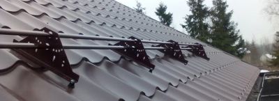 Монтаж трубчатых снегозадержателей на металлочерепицу требует использования специальных скоб, которые крепятся к профилю крыши. Для этой цели часто применяются кронштейны из оцинкованной стали с полимерным покрытием, предотвращающим образование ржавчины.